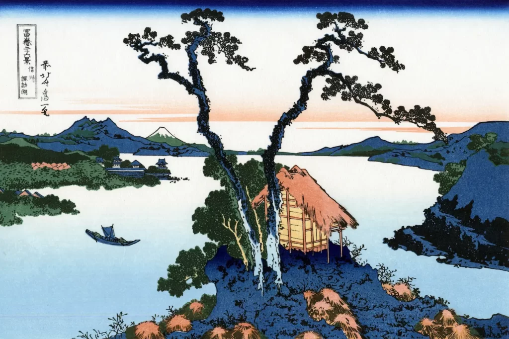 葛飾北斎の名作「冨嶽三十六景 信州諏訪湖」が壁紙になりました!日本画をデジタルプリントした壁紙アートで、風景の美しさをお部屋に取り入れませんか?壁紙のデザインは大胆で迫力満点。葛飾北斎の時代に思いを馳せながら、日本の風景美を感じることができます。