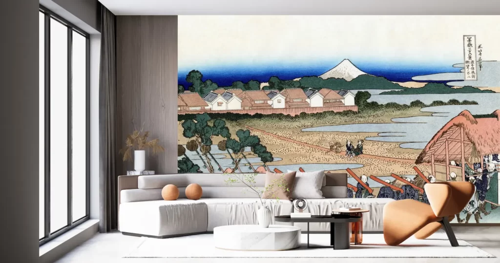 葛飾北斎の名作「冨嶽三十六景 従千住花街眺望ノ不二」を壁紙にしました。日本画の風景が、お部屋に美しいアートを提供します。イラストはデジタルプリントで再現され、クロスになって販売しております。塩化ビニル樹脂系壁紙なので、壁紙の交換も簡単にできます。ご自宅でのDIYも簡単に行えます。和風のインテリアにぴったりの絵画風の壁紙で、お部屋の雰囲気を一新しませんか?