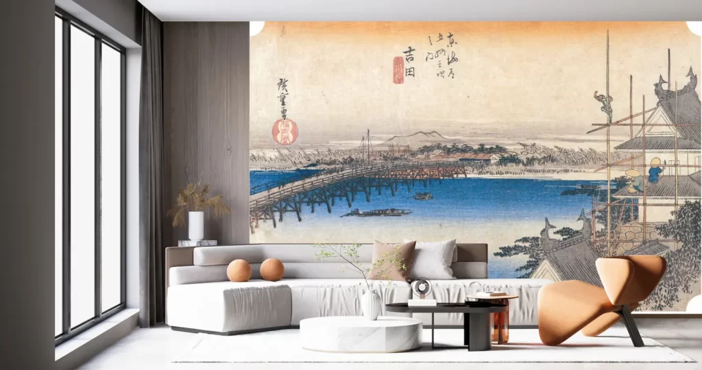 壁紙アート歌川広重東海道五拾三次之内 吉田 豊川橋は、壁面を飾るだけでなく、風景に思いを馳せることで心を落ち着かせ、リラックスさせる効果もあります。日本の美しさを感じさせる一つのアートとして、ぜひご利用ください。