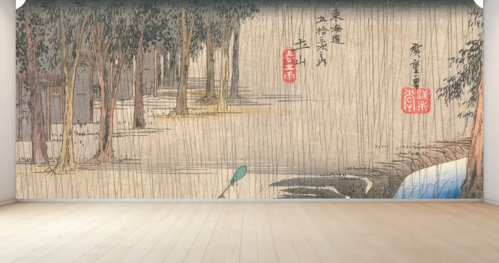 【新商品】壁紙アート歌川広重 東海道五拾三次之内 土山 春之雨 クロス 日本画 インテリア 絵画 時代 風景 デジタルプリント のり無し 塩化ビニル樹脂系壁紙