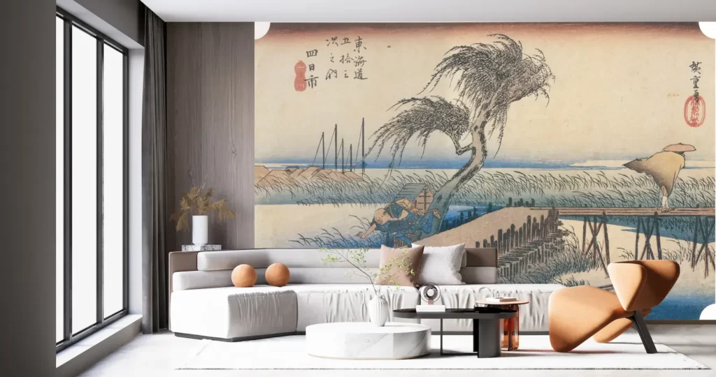 【新商品】壁紙アート歌川広重 東海道五拾三次之内 四日市 三重川 クロス 日本画 インテリア 絵画 時代 風景 デジタルプリント のり無し 塩化ビニル樹脂系壁紙