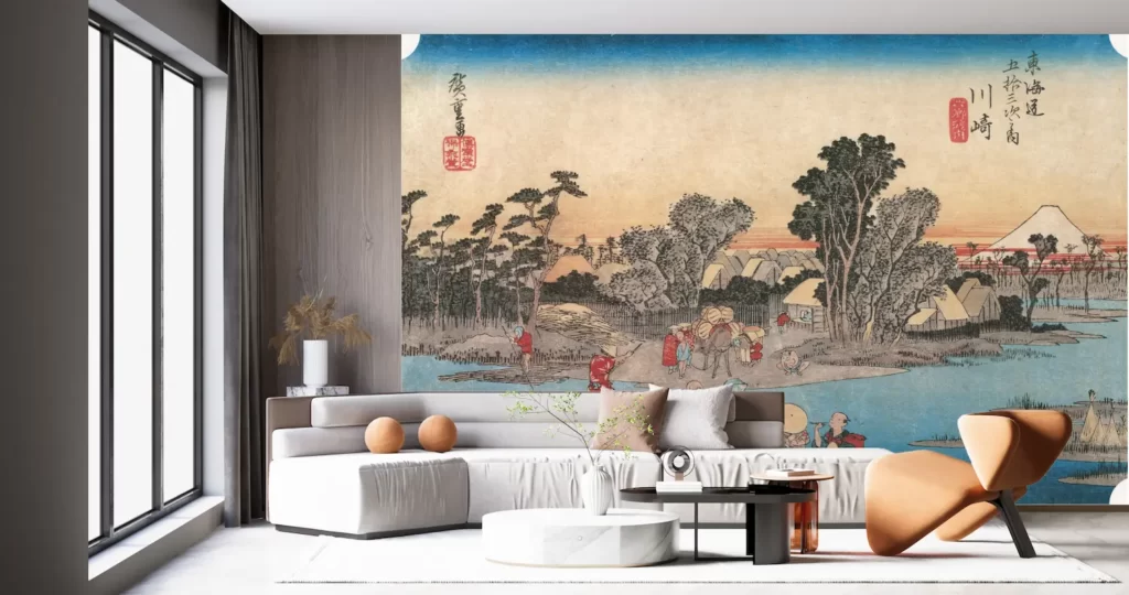 この壁紙アートは、古き良き時代の日本の風景を描いた歌川広重の作品をデジタルプリントしたものです。豪華な絵画のようなデザインで、お部屋の雰囲気を一瞬で変えることができます。和室や和風のインテリアにぴったりですが、モダンな空間に取り入れても絶妙なアクセントになります。