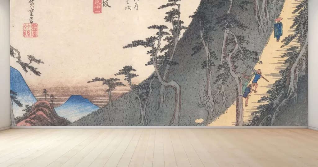 東海道五拾三次之内 日坂 佐夜ノ中山の風景は、四季折々の美しさが詰まった絶景です。その景色をあなたのお部屋に演出できるのは、壁紙アートならではの魅力です。