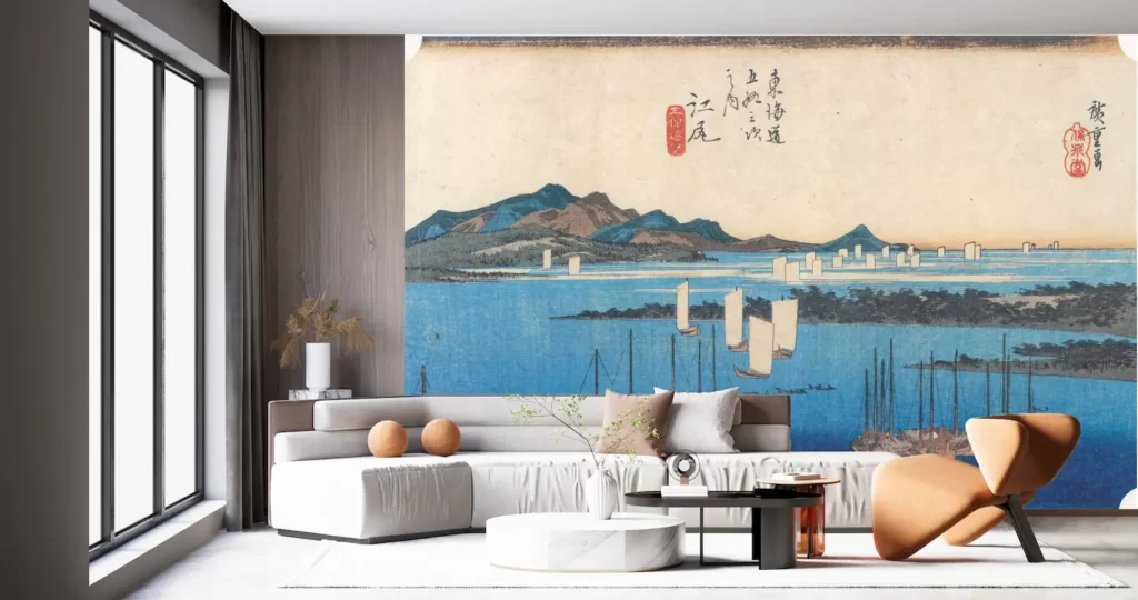 【新商品】壁紙アート歌川広重 東海道五拾三次之内 江尻 三保遠望 クロス 日本画 インテリア 絵画 時代 風景 デジタルプリント のり無し 塩化ビニル樹脂系壁紙