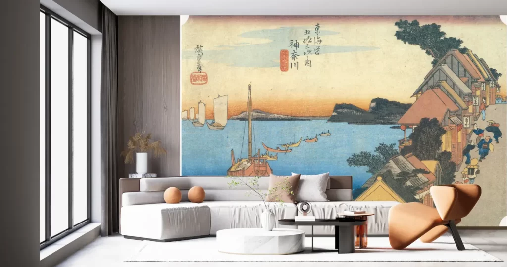 【新商品】 壁紙アート歌川広重 東海道五拾三次之内 神奈川 台之景 クロス 日本画 インテリア 絵画 時代 風景 デジタルプリント のり無し 塩化ビニル樹脂系壁紙