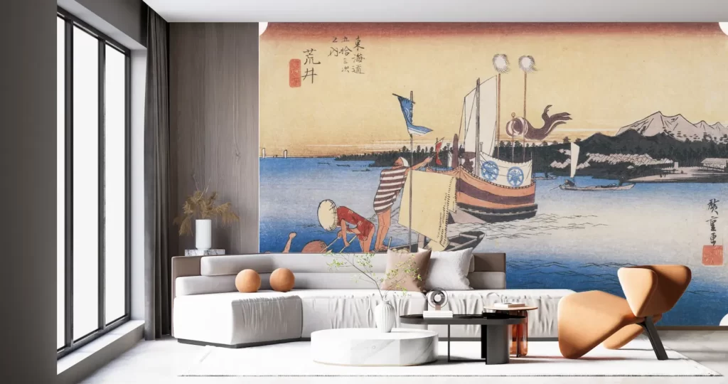 【新商品】 壁紙アート歌川広重 東海道五拾三次之内 荒井 渡舟ノ図 クロス 日本画 インテリア 絵画 時代 風景 デジタルプリント のり無し 塩化ビニル樹脂系壁紙
