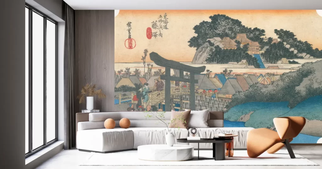 壁紙アート歌川広重の新商品、東海道五拾三次之内の藤沢 遊行寺が登場しました。日本画の雰囲気を取り入れたインテリアアートで、時代風景の美しさをお部屋に演出します。デジタルプリントと施工も簡単です。塩化ビニル樹脂系の壁紙は耐久性も抜群で、お部屋の雰囲気を一新させることができます。