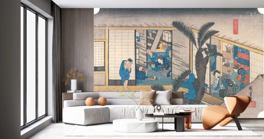壁紙アート歌川広重の「東海道五拾三次之内 赤阪 旅舎招婦ノ図」が新登場!日本画の風景をインテリアに取り入れる新しいスタイルが登場しました。デジタルプリントされた美しい絵画は、本物のようなクオリティでお部屋を彩ります。塩化ビニル樹脂系壁紙なので、簡単に貼り付けられる便利さもポイントです。