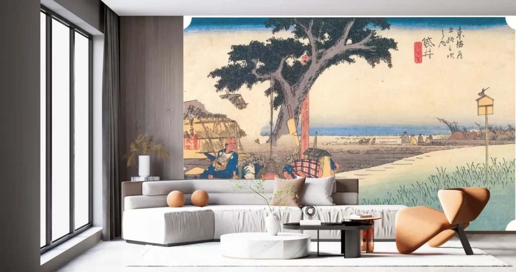 【新商品】壁紙アート歌川広重 東海道五拾三次之内 袋井 出茶屋ノ図 クロス 日本画 インテリア 絵画 風景 デジタルプリント のり無し 塩化ビニル樹脂系壁紙