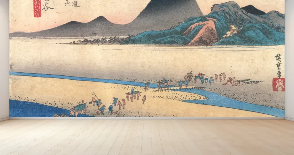 新しいデジタルプリントの壁紙アートが登場しました!歌川広重の名作「東海道五拾三次之内 金谷 大井川遠岸」をモチーフにした風景が、お部屋を一気に華やかに演出します。日本画のような独特な雰囲気を持つこの壁紙は、インテリアを格上げする一枚です。