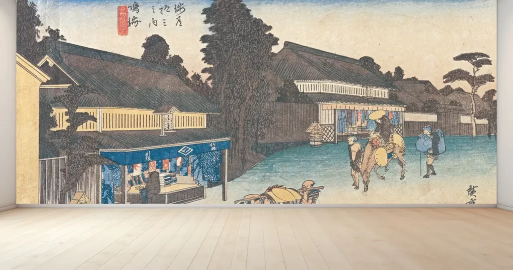 【新商品】壁紙アート歌川広重 東海道五拾三次之内 鳴海 名物有松絞 クロス 日本画 インテリア 絵画 風景 デジタルプリント のり無し 塩化ビニル樹脂系壁紙