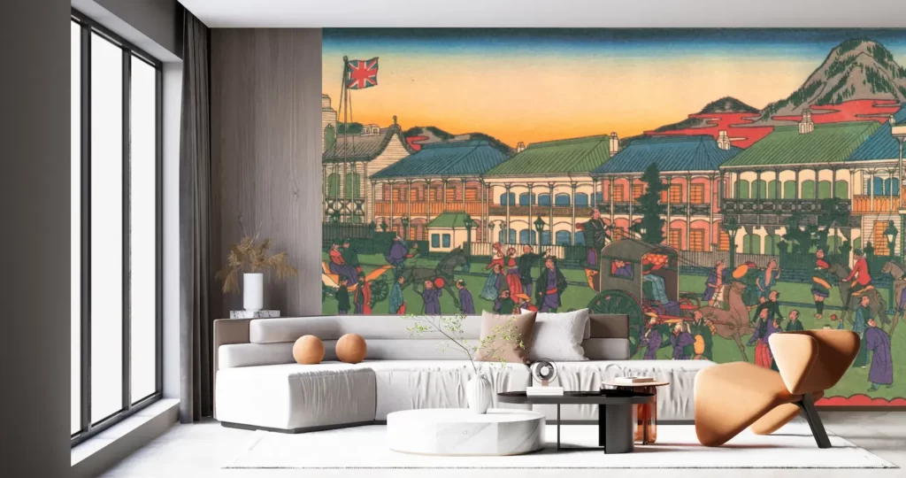 【新商品】壁紙アート二代目 長谷川貞信 攝州神戸新建西洋館 市街賑ひ之図 クロス 日本画 インテリア 絵画 風景 のり無し Wallpaper 塩化ビニル樹脂系壁紙