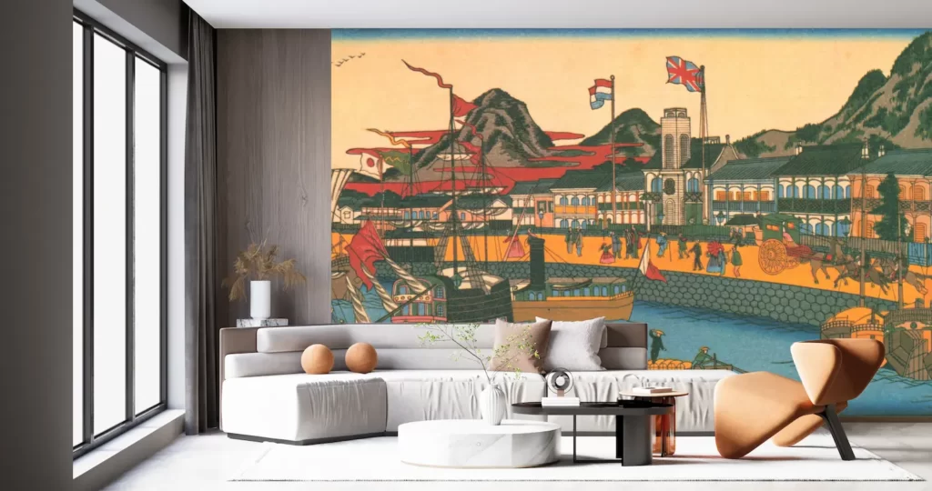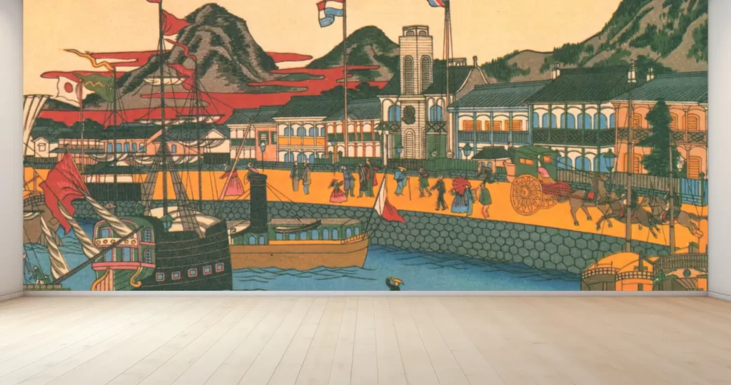 新商品の壁紙アート二代目 長谷川貞信による美しい風景を描いた壁紙が登場しました。神戸西洋館大湊の賑わいを描いたこのクロスは、日本画のような繊細な表現が特徴です。時代を感じさせる風景がお部屋を彩り、インテリアのアクセントになること間違いありません。