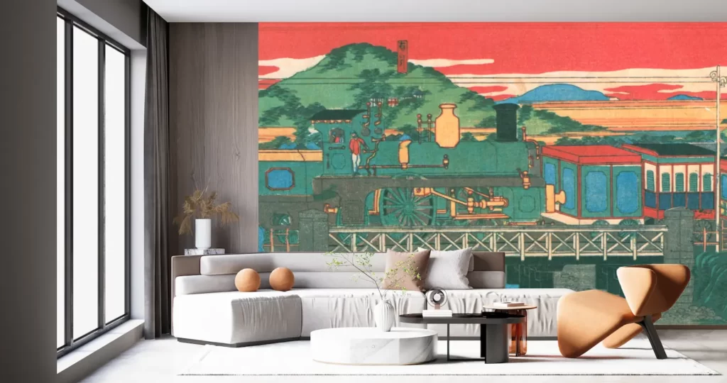 【新商品】壁紙アート二代目 長谷川貞信 神戸名所之内 生田川鉄道蒸気 クロス 日本画 インテリア 絵画 風景 時代 のり無し Wallpaper 塩化ビニル樹脂系壁紙