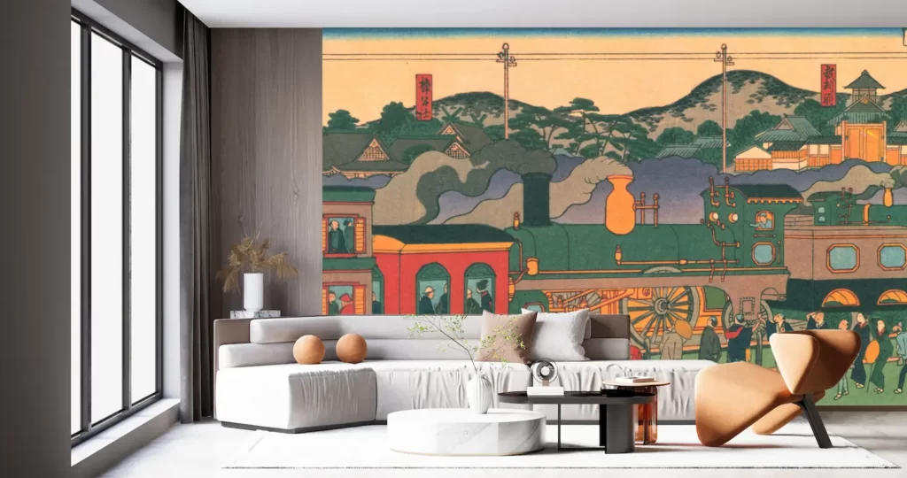 【新商品】壁紙アート二代目 長谷川貞信 神戸名物鉄道蒸気車之図 クロス 日本画 インテリア 絵画 風景 時代 のり無し Wallpaper 塩化ビニル樹脂系壁紙