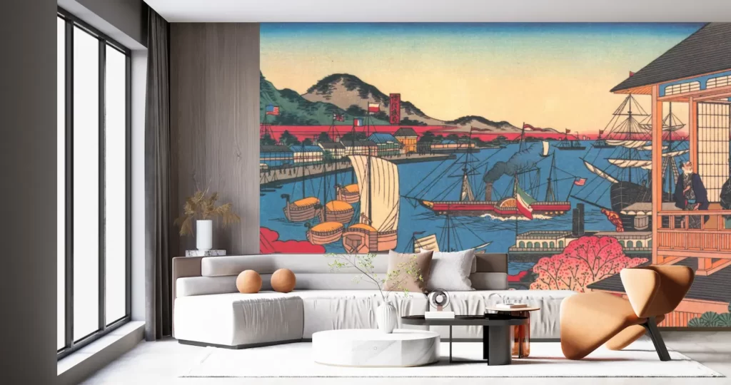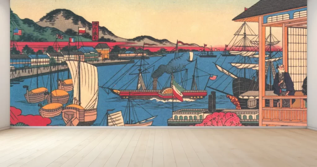 新商品登場!壁紙アート二代目 長谷川貞信 神戸海岸之図 新福原萬年楼三階 クロス。和風の美しい風景を描いた日本画が、お部屋のインテリアに華やかさをプラスします。時代を感じさせる風景が、お部屋に優雅な雰囲気を演出します。