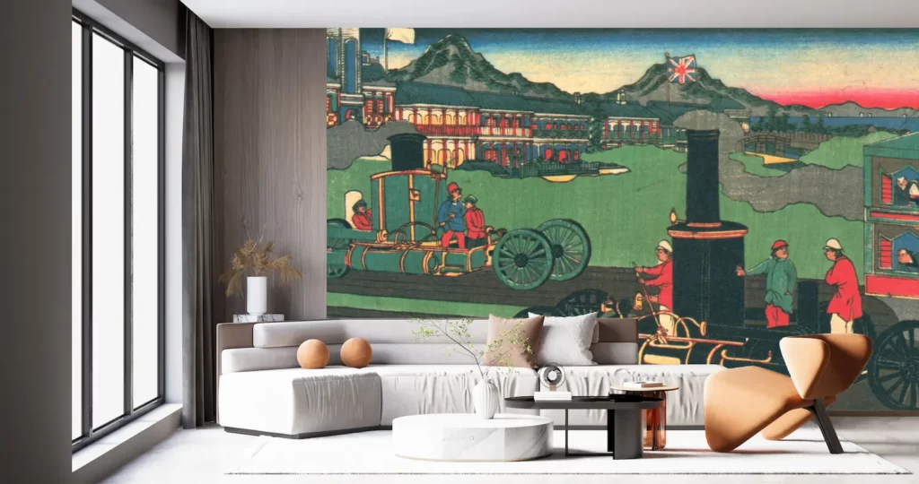 この壁紙アート二代目は、長谷川貞信の『鉄道往来蒸気車往帰之図』をモチーフにしたクロスです。日本画の風景をインテリアに取り入れることで、お部屋に趣を加えることができます。時代を感じさせる風景が描かれており、和風やヴィンテージテイストの部屋にぴったりです。