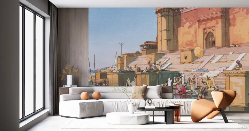 壁紙アート「吉田博 ベナレスのガット」は、日本画と洋画の融合による独創的なデザインが特徴です。吉田博氏の作品は、風景や時代を感じさせる美しいデザインで、お部屋のインテリアを一気に華やかに演出してくれます。デジタルプリント技術を駆使し、リアルな色彩や質感を再現した壁紙は、まるで絵画のような存在感があります。