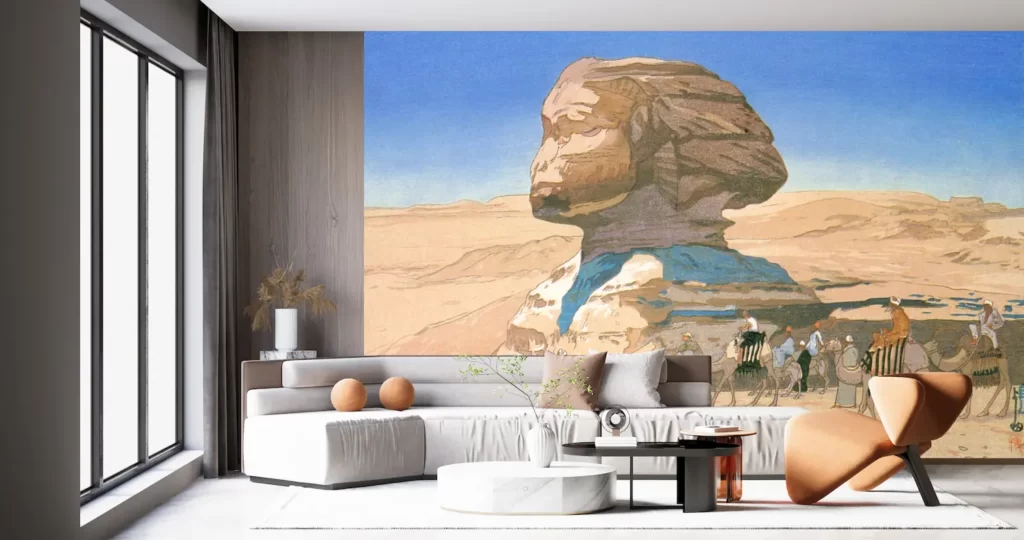 吉田博氏の手掛ける壁紙アートは、日本画の技法と洋画のテーマを融合させた独自のスタイルが特徴です。クラシカルなデザインに、モダンな要素を取り入れたスフィンクスのイラストは、一瞬で部屋の雰囲気を変えてくれることでしょう。風景や時代を感じさせる作品は、インテリアに一味違った彩りを添えます。