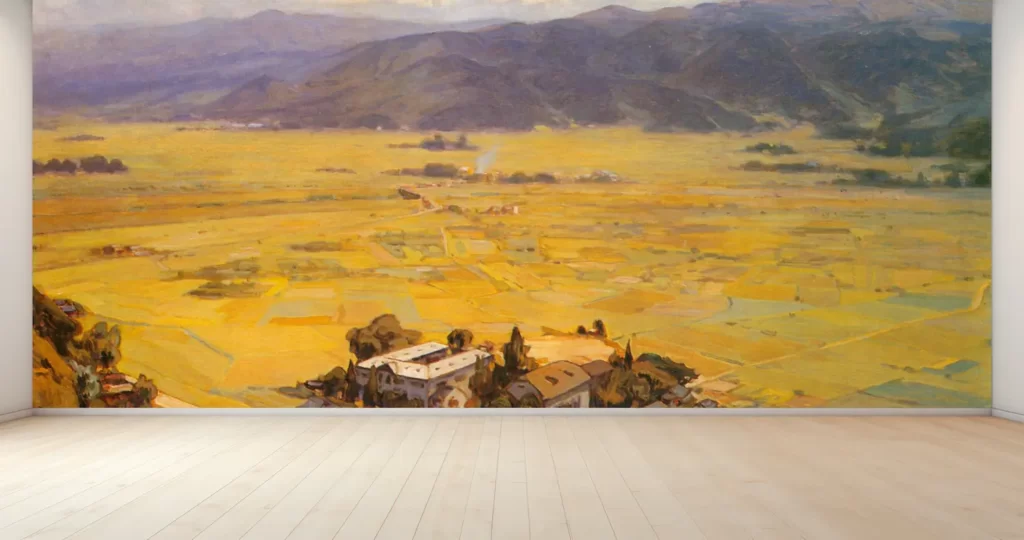 吉田博氏の作品を手軽にお楽しみいただける新商品、壁紙アートが登場しました!初秋の風景を描いたこのクロスは、吉田氏の繊細で美しい筆致が存分に表現された作品です。日本画と洋画の融合、時代と現代のコラボレーションを感じさせる一枚に仕上がっており、お部屋のインテリアに華やかさを加えること間違いなしです。デジタルプリントによる鮮やかな色彩が、お部屋を彩り豊かにしてくれます。さらに塩化ビニル樹脂系壁紙は、施工も簡単で耐久性も抜群。日常の中で吉田氏の作品に触れられる贅沢を、ぜひお楽しみください!