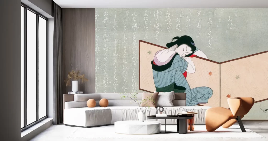 新商品「壁紙アート 小村雪岱 おせん お傳地獄 屏風」は、日本を代表する日本画家である小村雪岱の作品を壁紙にしたアートアイテムです。伝統的な日本画の技法を用いながらも、デジタルプリント技術を取り入れたこの壁紙は、美しい風景や風物詩をインテリアに広げる一枚です。塩化ビニル樹脂系壁紙なので、実用的で壁の一部としてもっともよく映えます。