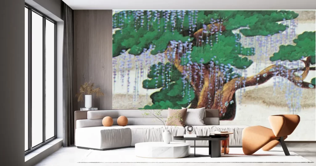 壁紙アートの新商品、小村雪岱の「藤娘」が登場しました!この作品は、日本画家であり版画家でもある小村雪岱が手掛けた舞台装置原画をデジタルプリントしたものです。風景や時代の情景が織り交ぜられた美しい絵画は、お部屋のインテリアにぴったり。塩化ビニル樹脂系の壁紙なので、簡単に貼り付けることができます。小村雪岱の繊細なタッチが、お部屋を一層個性的に彩ります。この壁紙アートが、あなたの日常に幻想的な風景を彩り、心を癒してくれることでしょう。是非、お部屋のアクセントとして取り入れてみてください。