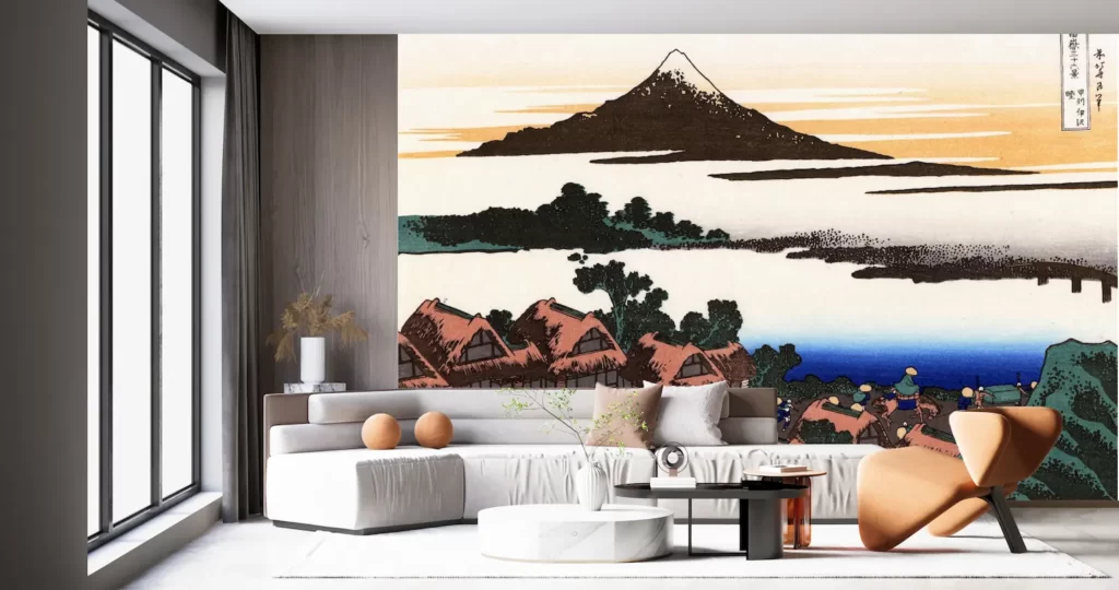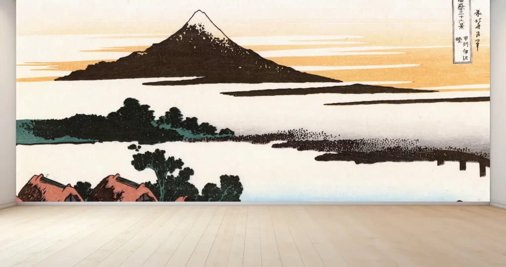 壁紙に美術を取り入れて、お部屋を際立たせませんか?新商品の壁紙アート、葛飾北斎の名作「富嶽三十六景 甲州伊沢暁」が手軽にお部屋に取り入れられるようになりました!日本画の美しさと風景の情緒を楽しめる、デジタルプリントの壁紙です。