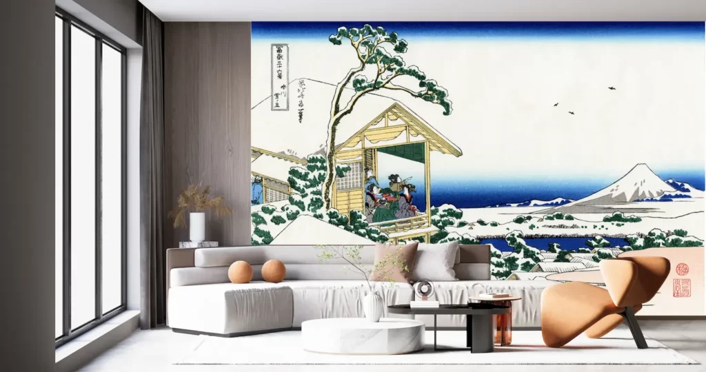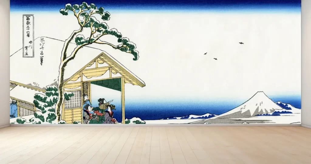 壁紙アートの最新作、葛飾北斎の「冨嶽三十六景 礫川雪の且」が登場しました。日本画の風景画をモチーフにしたこのアート壁紙は、お部屋のインテリアを一気に華やかに彩ります。