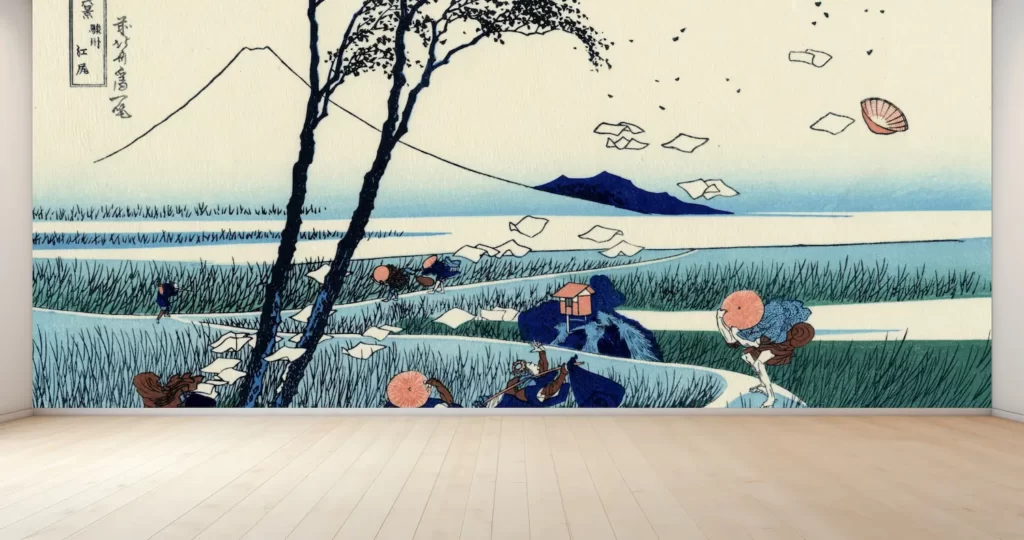 この壁紙は、繊細な葛飾北斎の技法や色使いを忠実に再現し、豪華さと風情を演出します。日本画のような美しい絵画がお部屋を彩り、和の風景を感じることができるでしょう。また、デジタルプリントによる鮮やかな色彩は、壁紙アートの新たなスタイルを提案します。